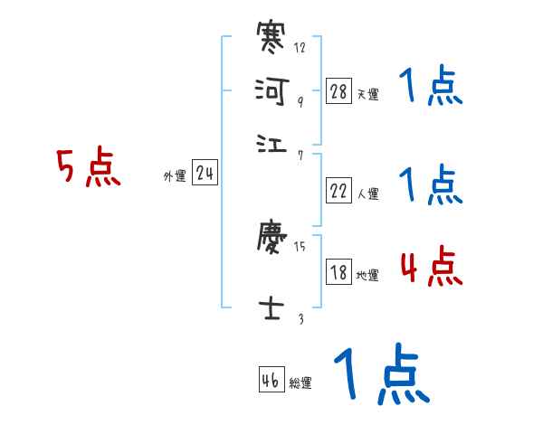 外運![]() | 寒河江慶士さんの外運は24画の5つ星!家庭運が良く順調な人生。金運にも恵まれる。 生活面を象徴する運勢です。外部から受ける影響力を表し、結婚運、家庭運や職場、環境への順応性を表します。 |