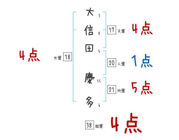 天運![]() | 大信田慶多さんの天運は17画の4つ星!積極的な行動力。地位を気づき財産を手に入れる。純粋な心と直感力。 家系が持つ宿命的な運勢を表します。祖先から受け継いだ苗字ですので自分の力が及びません。家柄を象徴します。 |