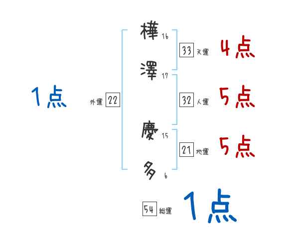 人運![]() | 樺澤慶多さんの人運は32画の5つ星!柔軟性があり成功する。チャンスが多く金運が良い。 性格や才能などを表す2番目に重要な運勢です。人間関係や協調性、社会的な成功に影響します。主に20歳から50歳ぐらいまでの中年期の運勢を表します。 |