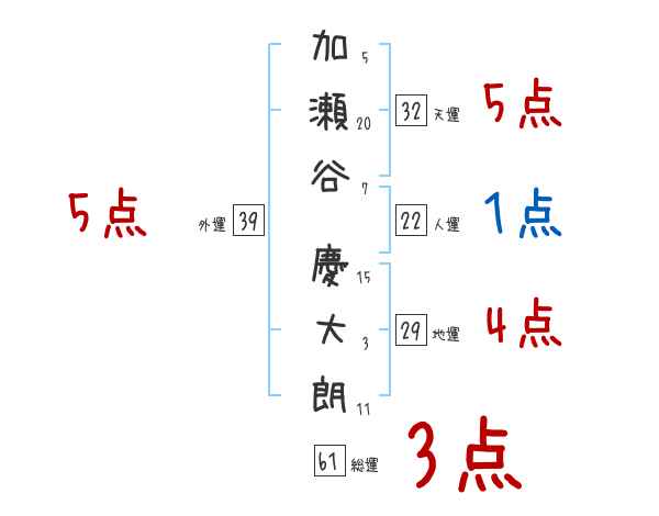 外運![]() | 加瀬谷慶大朗さんの外運は39画の5つ星!社交性に優れ人望が厚い。人の上に立ち成功する。 生活面を象徴する運勢です。外部から受ける影響力を表し、結婚運、家庭運や職場、環境への順応性を表します。 |