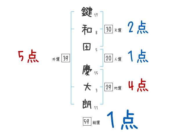 外運![]() | 鍵和田慶大朗さんの外運は39画の5つ星!社交性に優れ人望が厚い。人の上に立ち成功する。 生活面を象徴する運勢です。外部から受ける影響力を表し、結婚運、家庭運や職場、環境への順応性を表します。 |