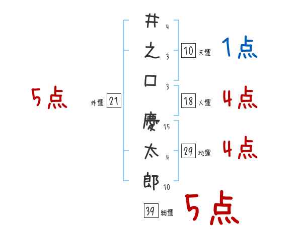 外運![]() | 井之口慶太郎さんの外運は21画の5つ星!統率力がある。独立し成功する。名誉を手に入れる。 生活面を象徴する運勢です。外部から受ける影響力を表し、結婚運、家庭運や職場、環境への順応性を表します。 |