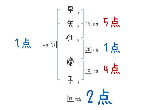 天運![]() | 早矢仕慶子さんの天運は16画の5つ星!人望が厚く大きく発展する。逆転成功が見える。 家系が持つ宿命的な運勢を表します。祖先から受け継いだ苗字ですので自分の力が及びません。家柄を象徴します。 |