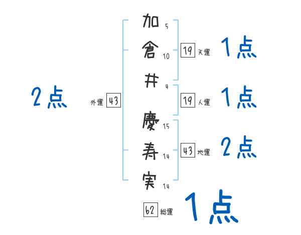 地運![]() | 加倉井慶寿実さんの地運は43画の2つ星!頑固な性格で独立心が強いかも。やや非現実的で浪費に注意しましょう。 個性を表す基礎的な運勢です。性格形成や対人関係、行動力など家庭環境に影響されます。主に誕生してから20歳くらいまでの若年期の運勢を表します。 |