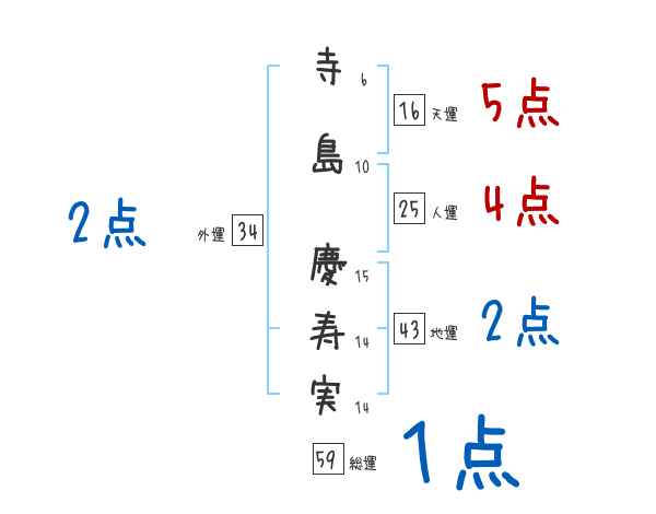 天運![]() | 寺島慶寿実さんの天運は16画の5つ星!人望が厚く大きく発展する。逆転成功が見える。 家系が持つ宿命的な運勢を表します。祖先から受け継いだ苗字ですので自分の力が及びません。家柄を象徴します。 |