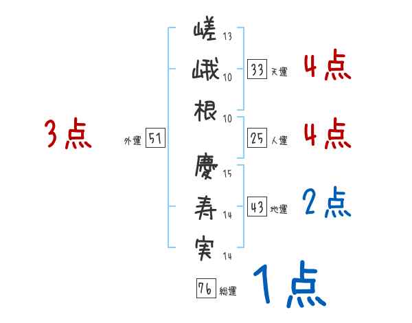 総運![]() | 嵯峨根慶寿実さんの総運は76画の1つ星!離散に注意。劣等感を感じ孤立しやすい傾向があるかも。 あなたの人生を表す1番重要な運勢です。生涯を通じて影響する総合運となり、主に50歳以降の晩年期に影響を及ぼします。 |