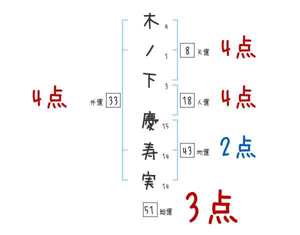 外運![]() | 木ノ下慶寿実さんの外運は33画の4つ星!権力志向でプライドが高い。勇気があり運を切り開き成功する。 生活面を象徴する運勢です。外部から受ける影響力を表し、結婚運、家庭運や職場、環境への順応性を表します。 |