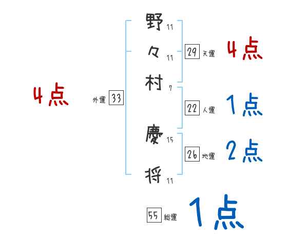 天運![]() | 野々村慶将さんの天運は29画の4つ星!完全主義で才能がある。厳格な心の持ち主。 家系が持つ宿命的な運勢を表します。祖先から受け継いだ苗字ですので自分の力が及びません。家柄を象徴します。 |