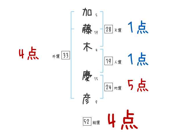 外運![]() | 加藤木慶彦さんの外運は33画の4つ星!権力志向でプライドが高い。勇気があり運を切り開き成功する。 生活面を象徴する運勢です。外部から受ける影響力を表し、結婚運、家庭運や職場、環境への順応性を表します。 |