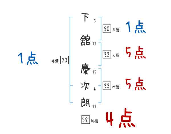 人運![]() | 下舘慶次朗さんの人運は32画の5つ星!柔軟性があり成功する。チャンスが多く金運が良い。 性格や才能などを表す2番目に重要な運勢です。人間関係や協調性、社会的な成功に影響します。主に20歳から50歳ぐらいまでの中年期の運勢を表します。 |