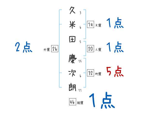 外運![]() | 久米田慶次朗さんの外運は26画の2つ星!波瀾万丈かも。信頼できる人を大事にしましょう。 生活面を象徴する運勢です。外部から受ける影響力を表し、結婚運、家庭運や職場、環境への順応性を表します。 |