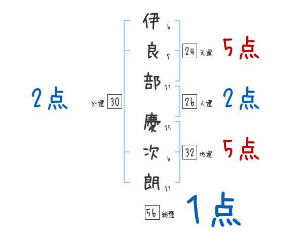 地運![]() | 伊良部慶次朗さんの地運は32画の5つ星!柔軟性があり成功する。チャンスが多く金運が良い。 個性を表す基礎的な運勢です。性格形成や対人関係、行動力など家庭環境に影響されます。主に誕生してから20歳くらいまでの若年期の運勢を表します。 |