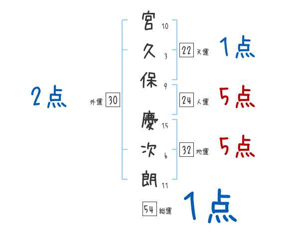 地運![]() | 宮久保慶次朗さんの地運は32画の5つ星!柔軟性があり成功する。チャンスが多く金運が良い。 個性を表す基礎的な運勢です。性格形成や対人関係、行動力など家庭環境に影響されます。主に誕生してから20歳くらいまでの若年期の運勢を表します。 |