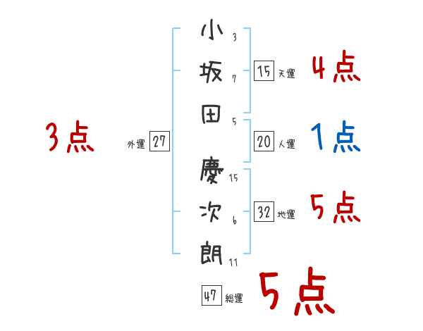 地運![]() | 小坂田慶次朗さんの地運は32画の5つ星!柔軟性があり成功する。チャンスが多く金運が良い。 個性を表す基礎的な運勢です。性格形成や対人関係、行動力など家庭環境に影響されます。主に誕生してから20歳くらいまでの若年期の運勢を表します。 |