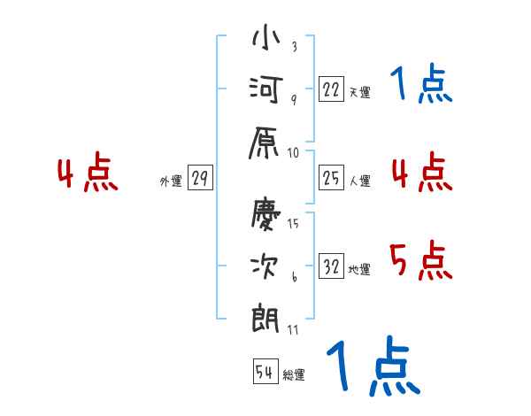 外運![]() | 小河原慶次朗さんの外運は29画の4つ星!完全主義で才能がある。厳格な心の持ち主。 生活面を象徴する運勢です。外部から受ける影響力を表し、結婚運、家庭運や職場、環境への順応性を表します。 |