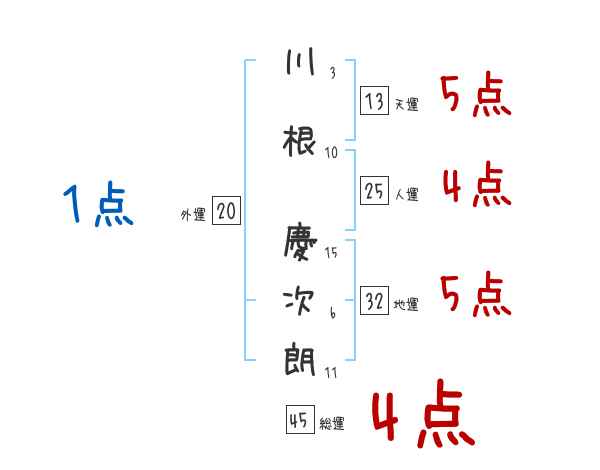 天運![]() | 川根慶次朗さんの天運は13画の5つ星!才能に恵まれ人気がある。名声を手に入れる。円満な人生。 家系が持つ宿命的な運勢を表します。祖先から受け継いだ苗字ですので自分の力が及びません。家柄を象徴します。 |