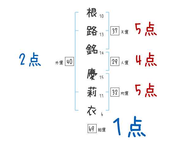 総運![]() | 根路銘慶莉衣さんの総運は69画の1つ星!不満を感じやすい傾向が。ストレスを貯めないように注意しましょう。 あなたの人生を表す1番重要な運勢です。生涯を通じて影響する総合運となり、主に50歳以降の晩年期に影響を及ぼします。 |