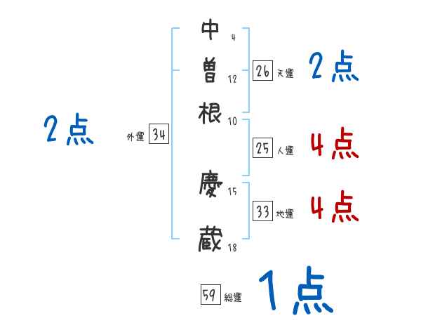 総運![]() | 中曽根慶蔵さんの総運は59画の1つ星!意志の弱さであきらめることが多いかも。粘り強さが必要。 あなたの人生を表す1番重要な運勢です。生涯を通じて影響する総合運となり、主に50歳以降の晩年期に影響を及ぼします。 |