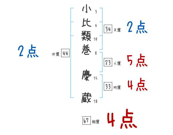 外運![]() | 小比類巻慶蔵さんの外運は44画の2つ星!誠実で慎重な性格。物事を考えすぎないように注意しましょう。 生活面を象徴する運勢です。外部から受ける影響力を表し、結婚運、家庭運や職場、環境への順応性を表します。 |