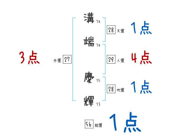 天運![]() | 溝端慶輝さんの天運は28画の1つ星!家庭環境に注意。スポーツで活躍できる能力があるかも。 家系が持つ宿命的な運勢を表します。祖先から受け継いだ苗字ですので自分の力が及びません。家柄を象徴します。 |