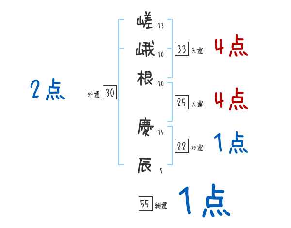 天運![]() | 嵯峨根慶辰さんの天運は33画の4つ星!権力志向でプライドが高い。勇気があり運を切り開き成功する。 家系が持つ宿命的な運勢を表します。祖先から受け継いだ苗字ですので自分の力が及びません。家柄を象徴します。 |