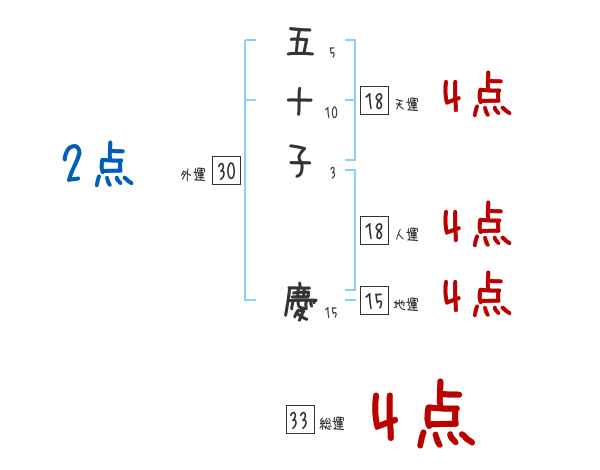 天運![]() | 五十子慶さんの天運は18画の4つ星!情熱的で剛気。忍耐力があり信頼される。 家系が持つ宿命的な運勢を表します。祖先から受け継いだ苗字ですので自分の力が及びません。家柄を象徴します。 |