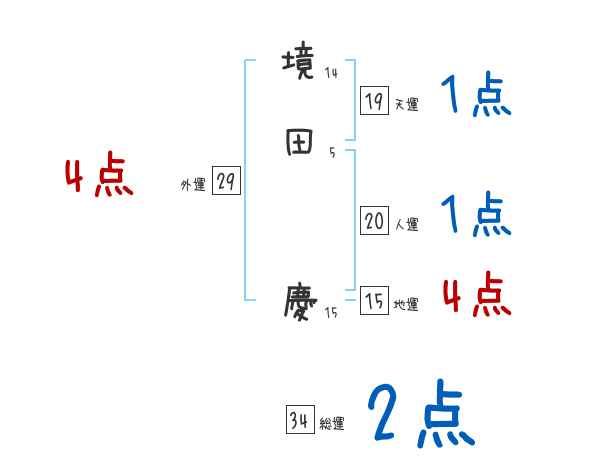 外運![]() | 境田慶さんの外運は29画の4つ星!完全主義で才能がある。厳格な心の持ち主。 生活面を象徴する運勢です。外部から受ける影響力を表し、結婚運、家庭運や職場、環境への順応性を表します。 |