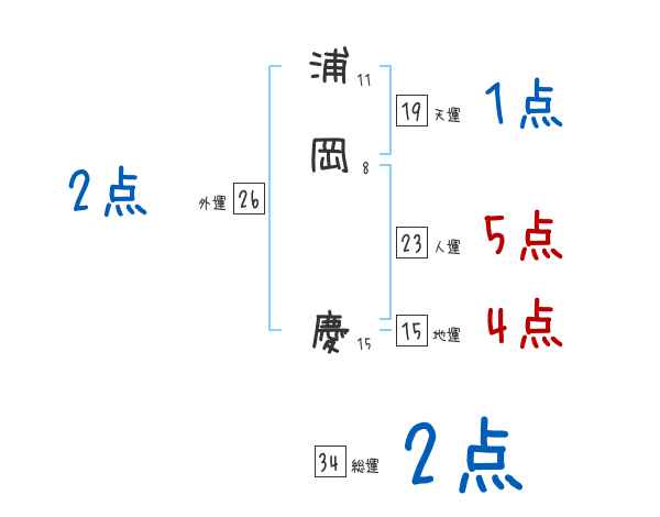 外運![]() | 浦岡慶さんの外運は26画の2つ星!波瀾万丈かも。信頼できる人を大事にしましょう。 生活面を象徴する運勢です。外部から受ける影響力を表し、結婚運、家庭運や職場、環境への順応性を表します。 |