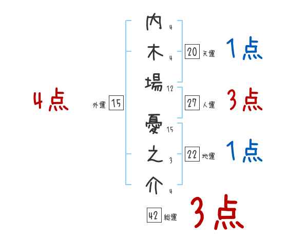 外運![]() | 内木場憂之介さんの外運は15画の4つ星!人徳があり出世する。順調に物事を進め円満な人生。 生活面を象徴する運勢です。外部から受ける影響力を表し、結婚運、家庭運や職場、環境への順応性を表します。 |