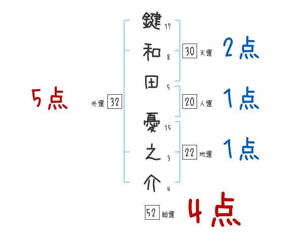 外運![]() | 鍵和田憂之介さんの外運は32画の5つ星!柔軟性があり成功する。チャンスが多く金運が良い。 生活面を象徴する運勢です。外部から受ける影響力を表し、結婚運、家庭運や職場、環境への順応性を表します。 |