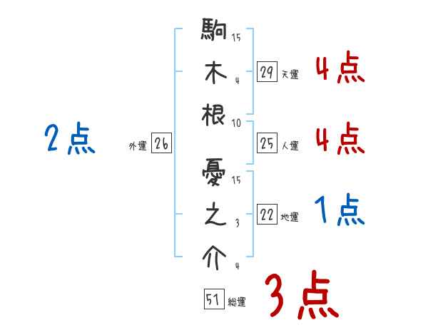 総運![]() | 駒木根憂之介さんの総運は51画の3つ星!変化が激しく、危険に注意。堅実な性格。 あなたの人生を表す1番重要な運勢です。生涯を通じて影響する総合運となり、主に50歳以降の晩年期に影響を及ぼします。 |