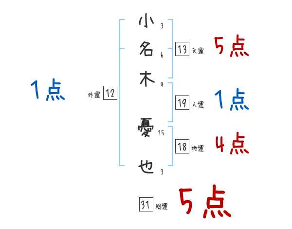 天運![]() | 小名木憂也さんの天運は13画の5つ星!才能に恵まれ人気がある。名声を手に入れる。円満な人生。 家系が持つ宿命的な運勢を表します。祖先から受け継いだ苗字ですので自分の力が及びません。家柄を象徴します。 |