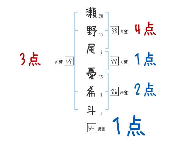 外運![]() | 瀬野尾憂希斗さんの外運は42画の3つ星!病気に注意。多芸であるが消極的でおとなしい。 生活面を象徴する運勢です。外部から受ける影響力を表し、結婚運、家庭運や職場、環境への順応性を表します。 |