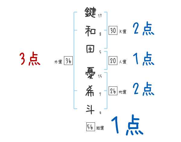 外運![]() | 鍵和田憂希斗さんの外運は36画の3つ星!先見性が豊かです。多少神経質で苦労することも。 生活面を象徴する運勢です。外部から受ける影響力を表し、結婚運、家庭運や職場、環境への順応性を表します。 |