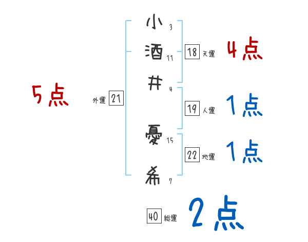 外運![]() | 小酒井憂希さんの外運は21画の5つ星!統率力がある。独立し成功する。名誉を手に入れる。 生活面を象徴する運勢です。外部から受ける影響力を表し、結婚運、家庭運や職場、環境への順応性を表します。 |