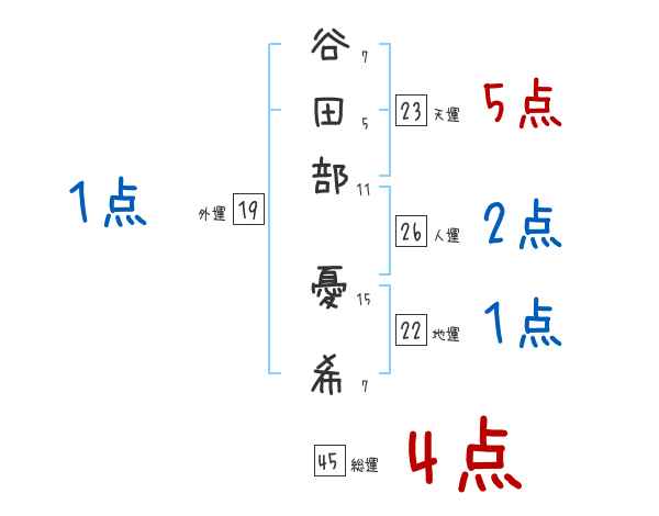 天運![]() | 谷田部憂希さんの天運は23画の5つ星!想像力に優れ活力がある。一代で成功し名誉を手に入れる。 家系が持つ宿命的な運勢を表します。祖先から受け継いだ苗字ですので自分の力が及びません。家柄を象徴します。 |