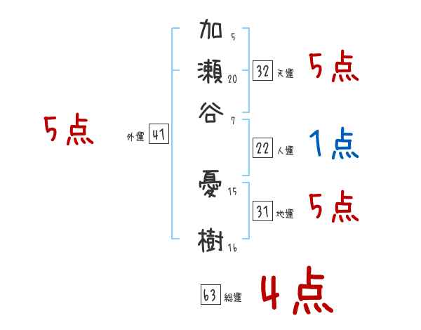 天運![]() | 加瀬谷憂樹さんの天運は32画の5つ星!柔軟性があり成功する。チャンスが多く金運が良い。 家系が持つ宿命的な運勢を表します。祖先から受け継いだ苗字ですので自分の力が及びません。家柄を象徴します。 |