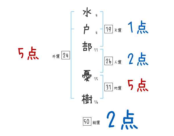 外運![]() | 水戸部憂樹さんの外運は24画の5つ星!家庭運が良く順調な人生。金運にも恵まれる。 生活面を象徴する運勢です。外部から受ける影響力を表し、結婚運、家庭運や職場、環境への順応性を表します。 |