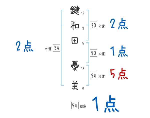 天運![]() | 鍵和田憂美さんの天運は30画の2つ星!浮き沈みの激しさに注意しましょう。 家系が持つ宿命的な運勢を表します。祖先から受け継いだ苗字ですので自分の力が及びません。家柄を象徴します。 |