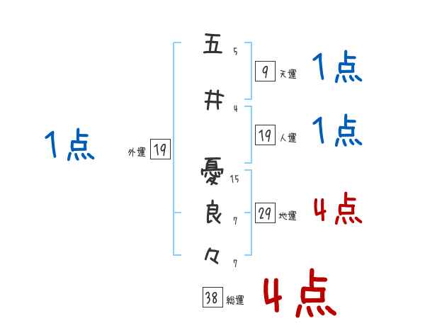 総運![]() | 五井憂良々さんの総運は38画の4つ星!温厚な性格で技術的な才能を発揮する。職人的な仕事に向いている。 あなたの人生を表す1番重要な運勢です。生涯を通じて影響する総合運となり、主に50歳以降の晩年期に影響を及ぼします。 |