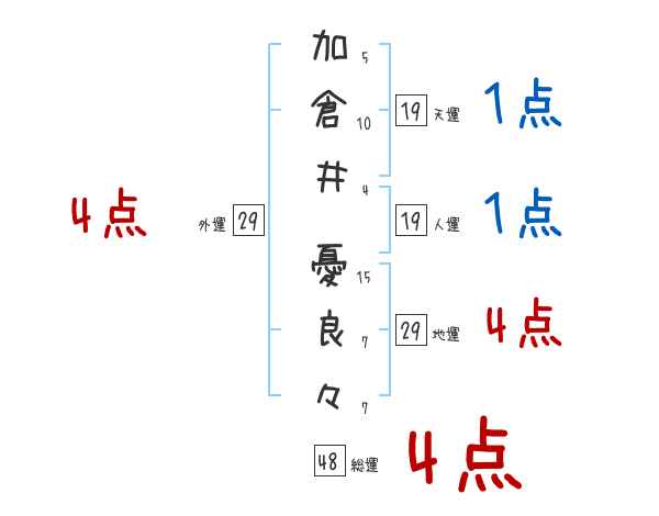 外運![]() | 加倉井憂良々さんの外運は29画の4つ星!完全主義で才能がある。厳格な心の持ち主。 生活面を象徴する運勢です。外部から受ける影響力を表し、結婚運、家庭運や職場、環境への順応性を表します。 |