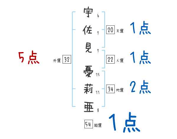 外運![]() | 宇佐見憂莉亜さんの外運は32画の5つ星!柔軟性があり成功する。チャンスが多く金運が良い。 生活面を象徴する運勢です。外部から受ける影響力を表し、結婚運、家庭運や職場、環境への順応性を表します。 |
