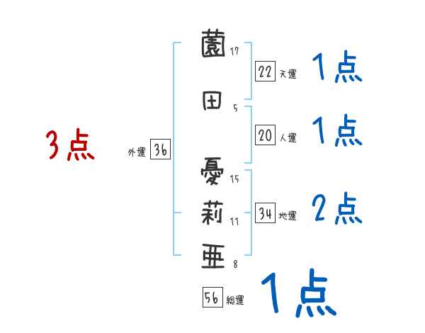外運![]() | 薗田憂莉亜さんの外運は36画の3つ星!先見性が豊かです。多少神経質で苦労することも。 生活面を象徴する運勢です。外部から受ける影響力を表し、結婚運、家庭運や職場、環境への順応性を表します。 |