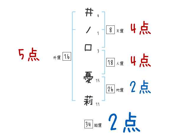外運![]() | 井ノ口憂莉さんの外運は16画の5つ星!人望が厚く大きく発展する。逆転成功が見える。 生活面を象徴する運勢です。外部から受ける影響力を表し、結婚運、家庭運や職場、環境への順応性を表します。 |