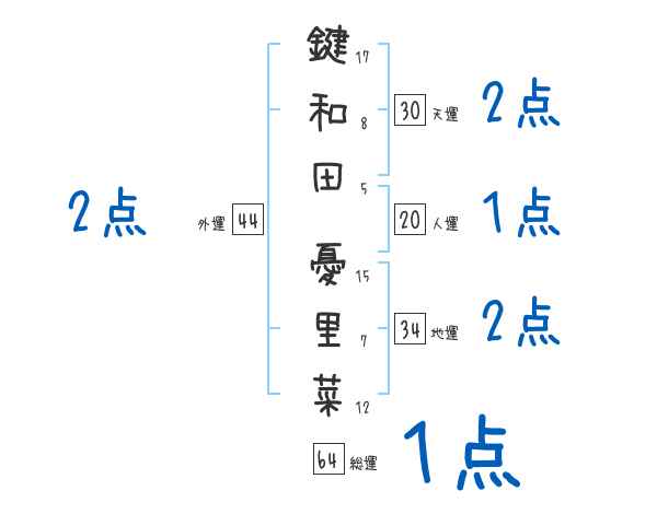 天運![]() | 鍵和田憂里菜さんの天運は30画の2つ星!浮き沈みの激しさに注意しましょう。 家系が持つ宿命的な運勢を表します。祖先から受け継いだ苗字ですので自分の力が及びません。家柄を象徴します。 |