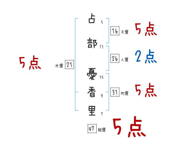 総運![]() | 占部憂香里さんの総運は47画の5つ星!実力が開花し発展する円満な人生。財に恵まれる。 あなたの人生を表す1番重要な運勢です。生涯を通じて影響する総合運となり、主に50歳以降の晩年期に影響を及ぼします。 |
