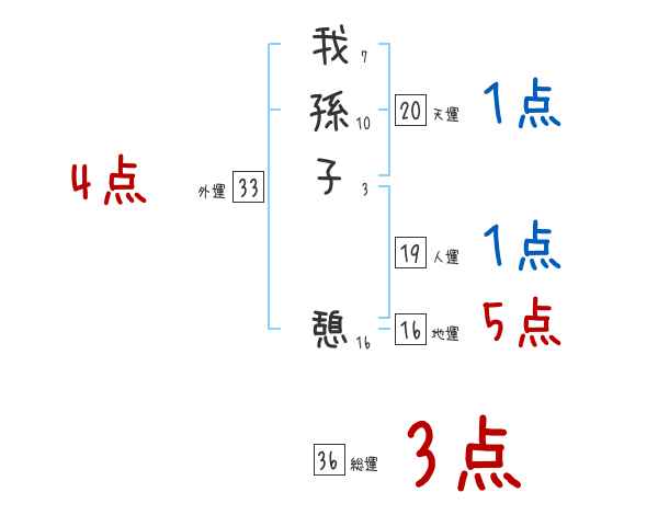 外運![]() | 我孫子憩さんの外運は33画の4つ星!権力志向でプライドが高い。勇気があり運を切り開き成功する。 生活面を象徴する運勢です。外部から受ける影響力を表し、結婚運、家庭運や職場、環境への順応性を表します。 |