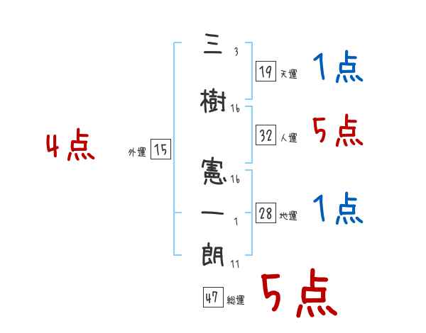 人運![]() | 三樹憲一朗さんの人運は32画の5つ星!柔軟性があり成功する。チャンスが多く金運が良い。 性格や才能などを表す2番目に重要な運勢です。人間関係や協調性、社会的な成功に影響します。主に20歳から50歳ぐらいまでの中年期の運勢を表します。 |