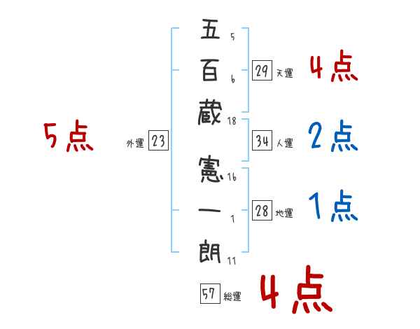 外運![]() | 五百蔵憲一朗さんの外運は23画の5つ星!想像力に優れ活力がある。一代で成功し名誉を手に入れる。 生活面を象徴する運勢です。外部から受ける影響力を表し、結婚運、家庭運や職場、環境への順応性を表します。 |