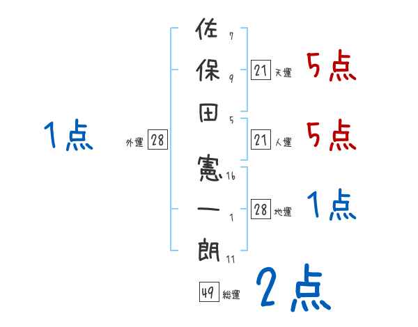 天運![]() | 佐保田憲一朗さんの天運は21画の5つ星!統率力がある。独立し成功する。名誉を手に入れる。 家系が持つ宿命的な運勢を表します。祖先から受け継いだ苗字ですので自分の力が及びません。家柄を象徴します。 |